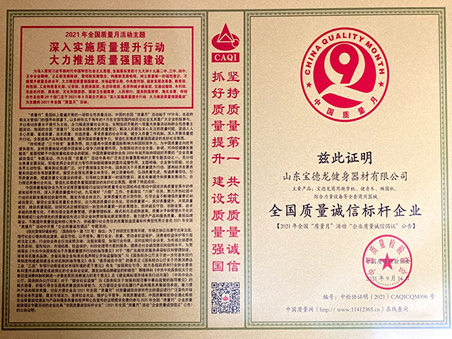 自品牌創立以來,寶德龍始終將質量和服務放在首位,獲得國(guó)家、各級政府、行業協會、各類客戶的廣泛認可;連續多年被評為“中國健身器材行業十大知名品(pǐn)牌”、“中國誠信名牌企業”、“全(quán)國質量(liàng)誠信標杆企(qǐ)業”。