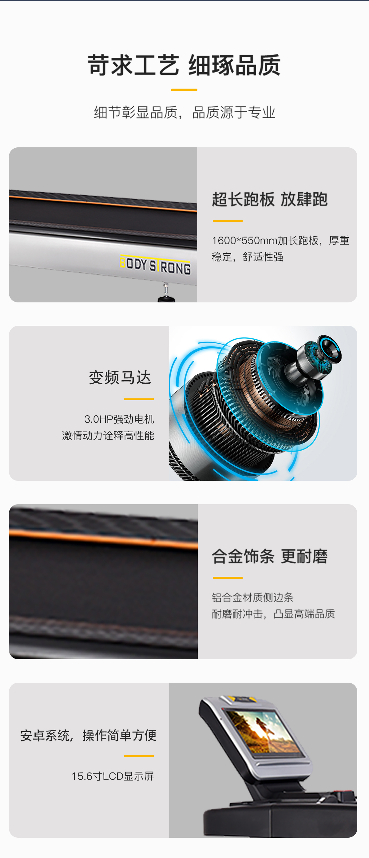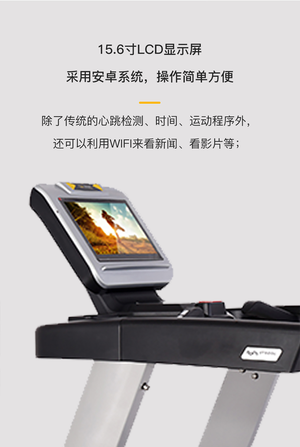 安卓係統,操作簡單方便。麵板上為 15.6寸LCD顯示屏,除了(le)傳(chuán)統的心跳檢測、時間、運動程序外(wài),還可以(yǐ)利(lì)用(yòng)WIFI來(lái)看新聞、看影片