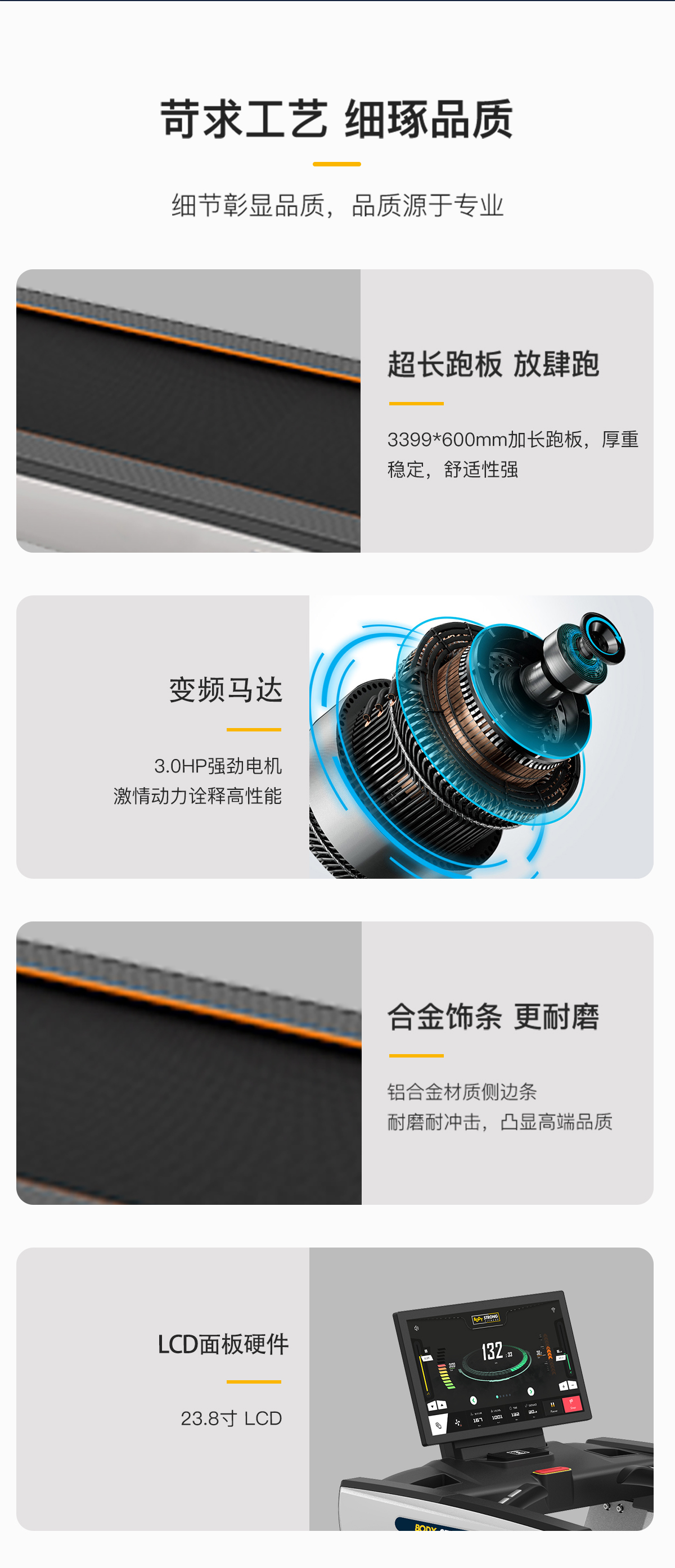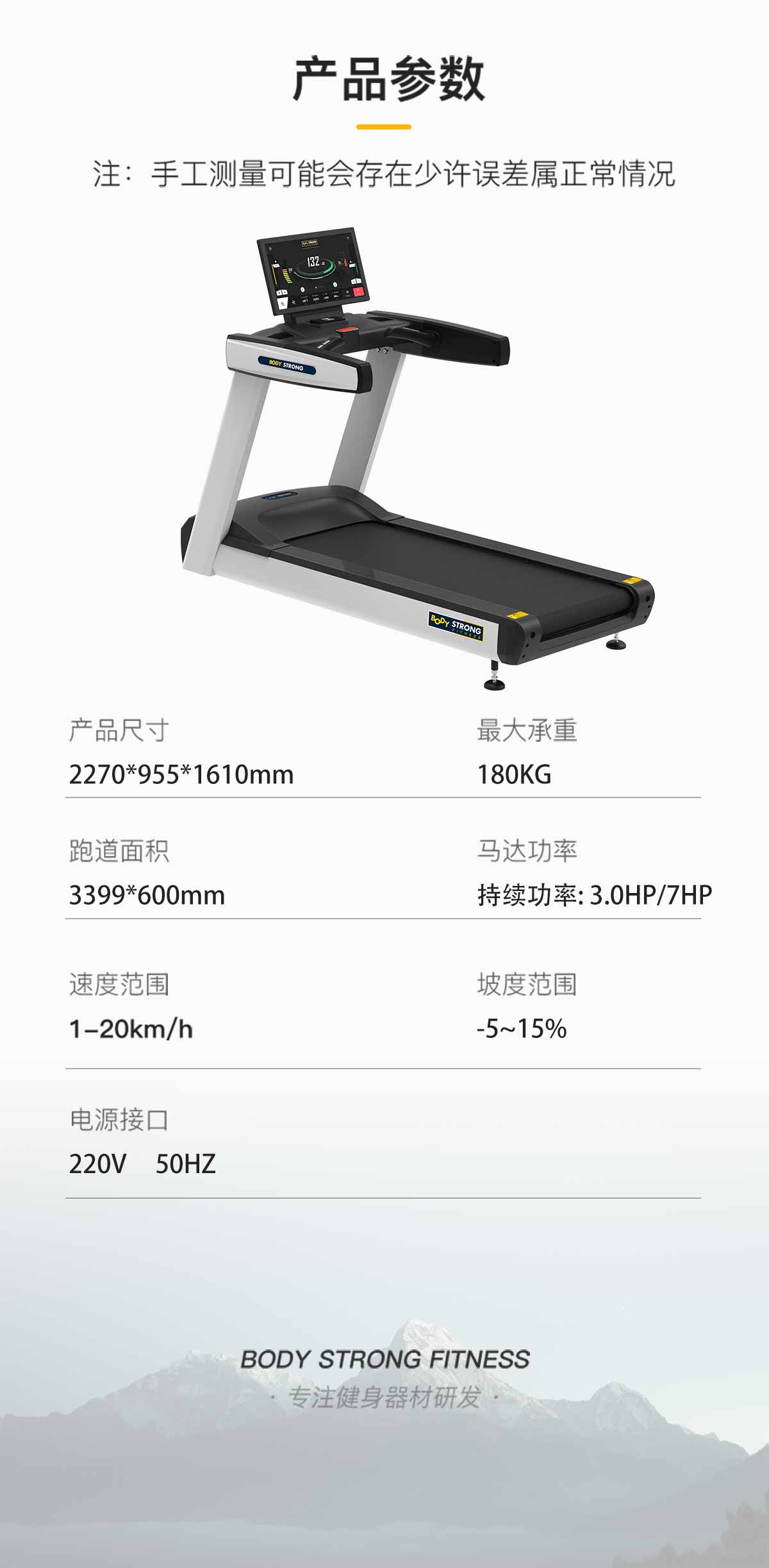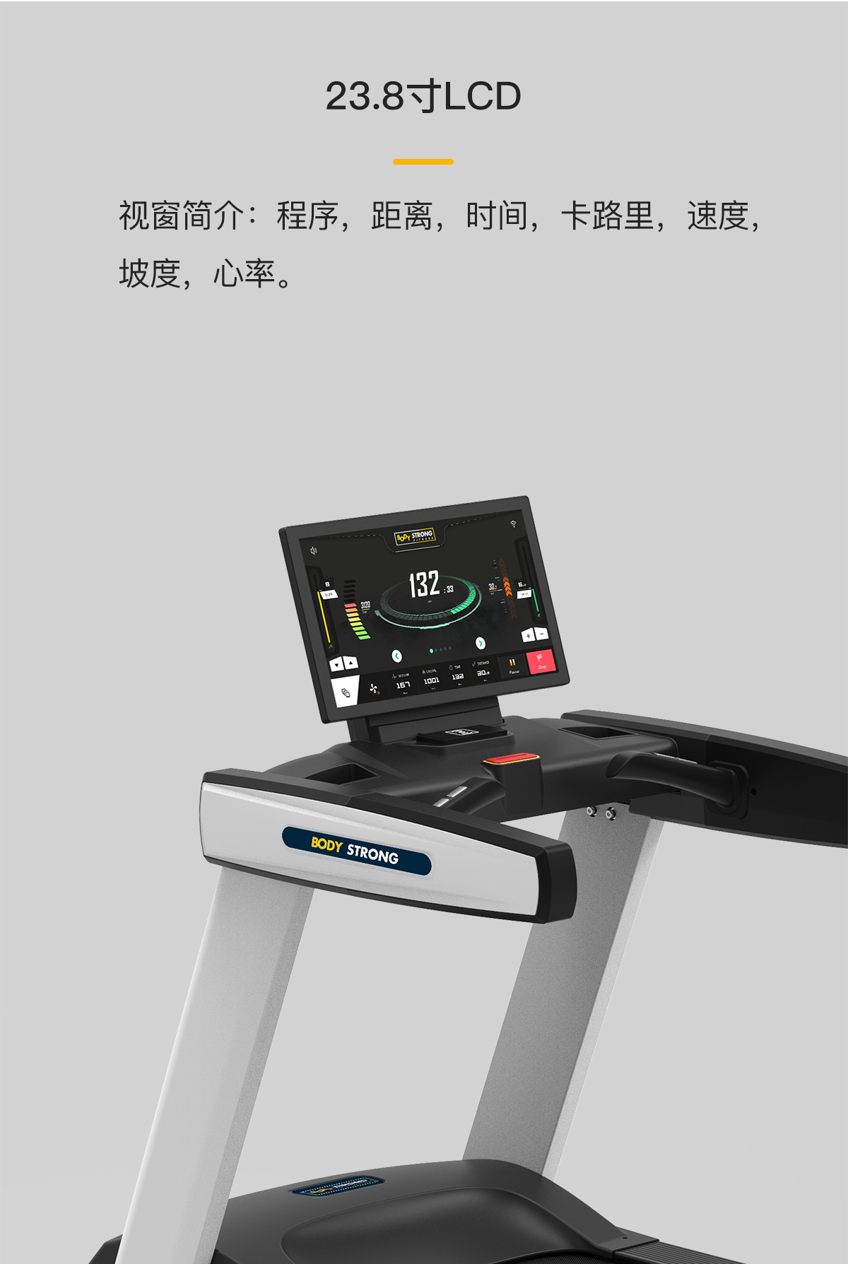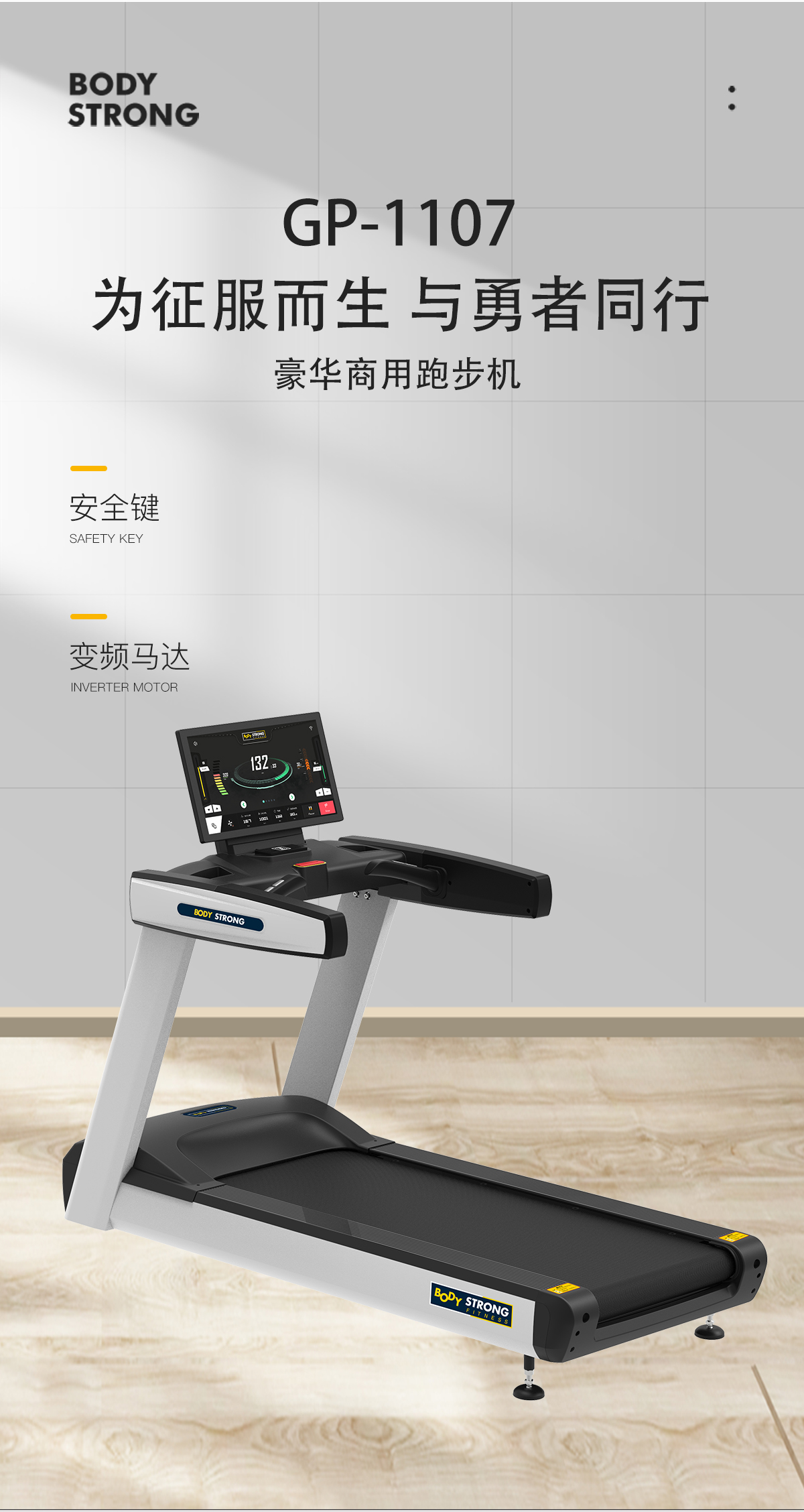 寶德龍健身器材GP-1107 商用(yòng)跑步(bù)機,23.8寸LCD顯示屏,無線充電,坡度範圍:-5%~15%,跑(pǎo)步表麵尺寸:1580mm*600mm,速度範圍:0.5起km/h~25km/h,跑帶厚度:4.0mm,主立管規則:110mm*40mm*2.5mm 矩形管,最大人體質量:210kg,地盤(pán)邊管規則:110mm*40mm*2.5mm 矩形管
