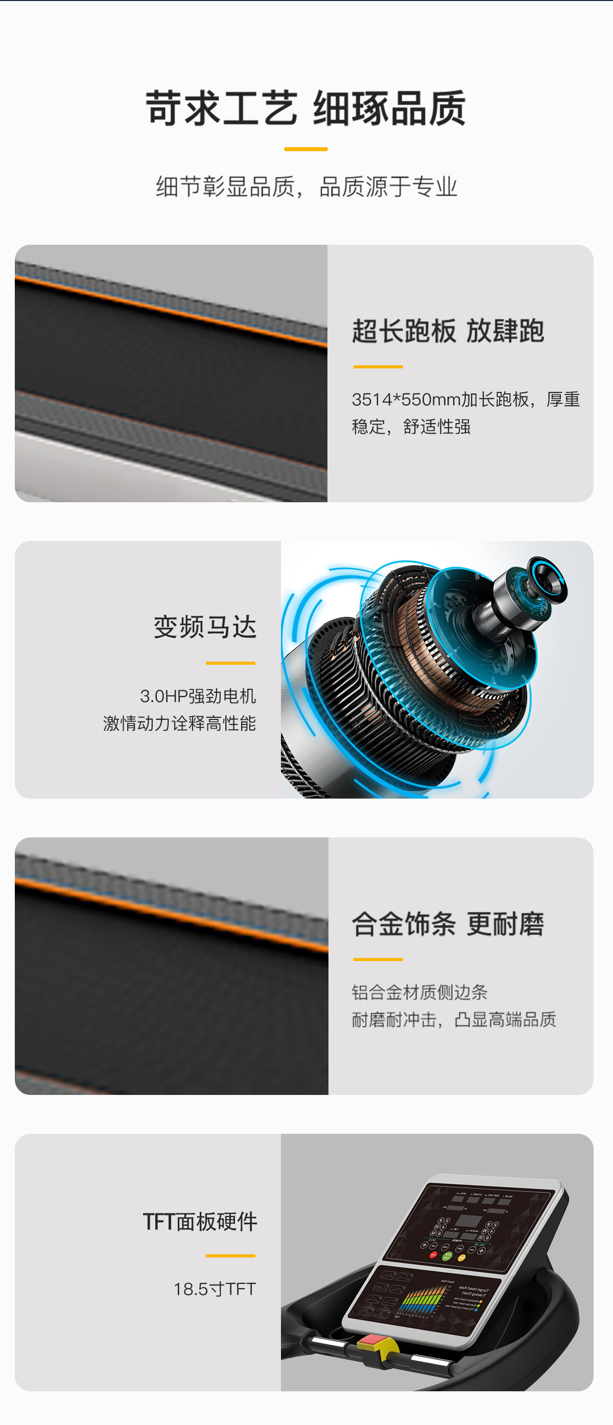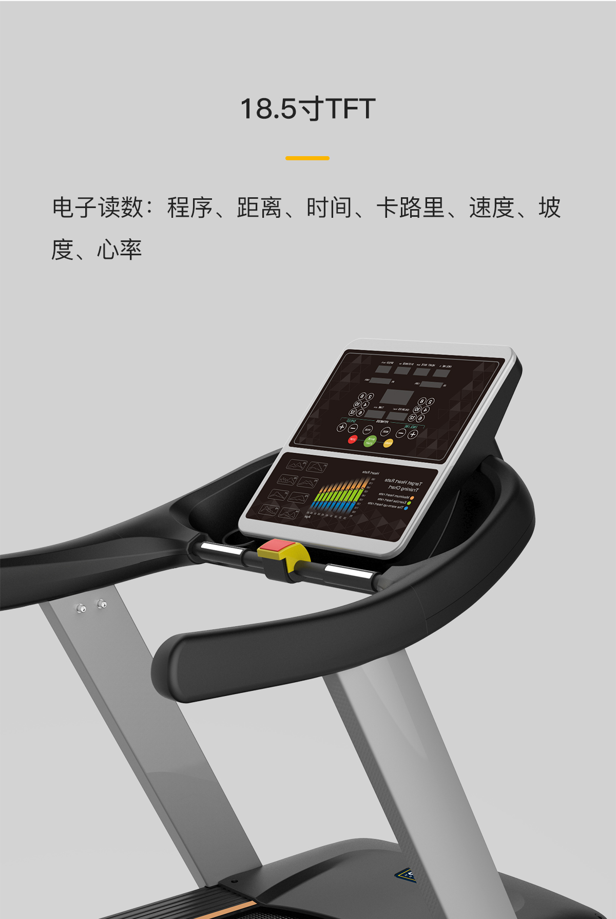 18.5寸LCD高清分辨率(lǜ)液晶顯示屏(píng),智能心率係統,防(fáng)震彈性跑板,特有的四重避震(zhèn)技術,自潤滑功能,USB:可連接移動外接設備