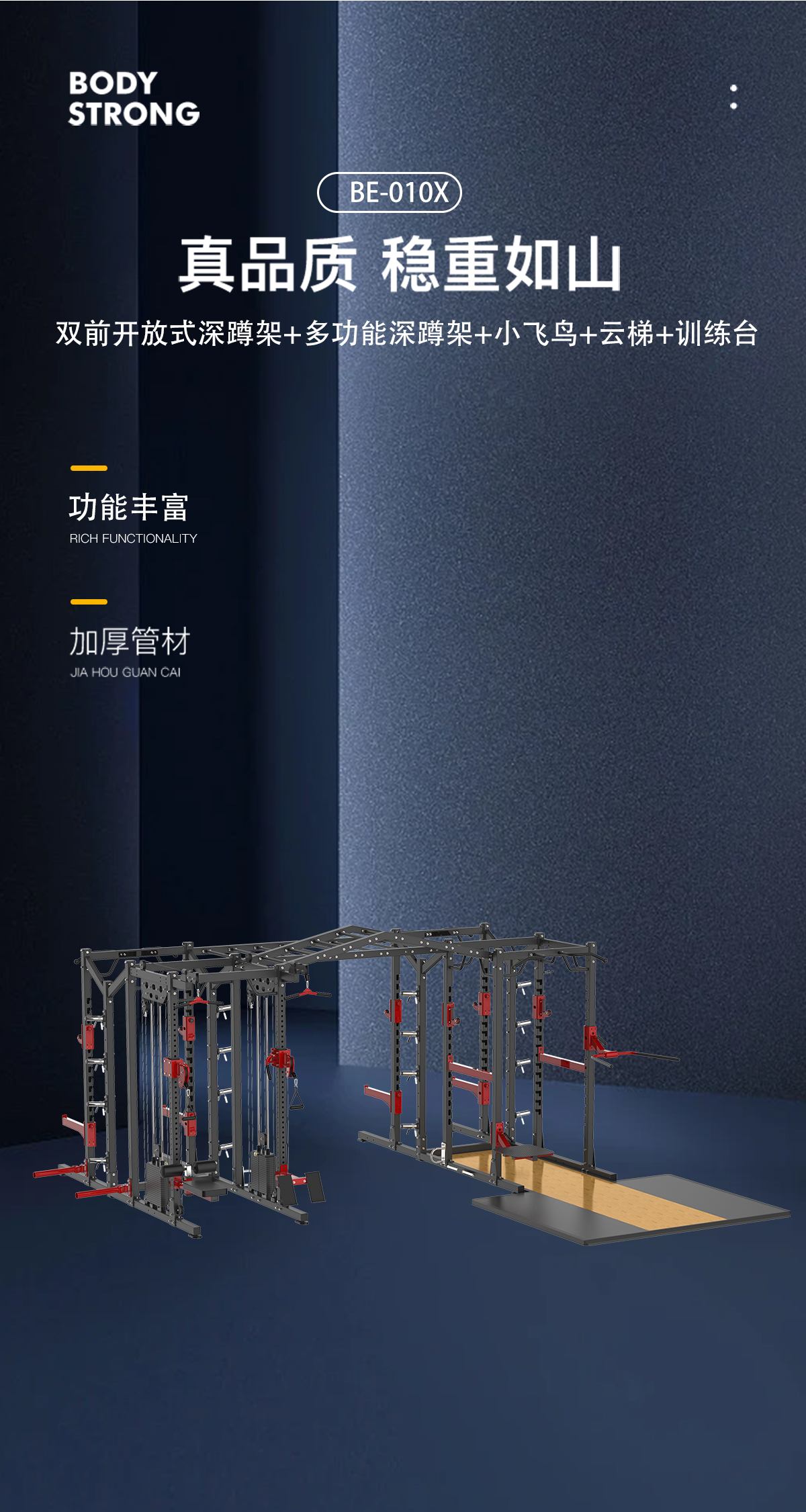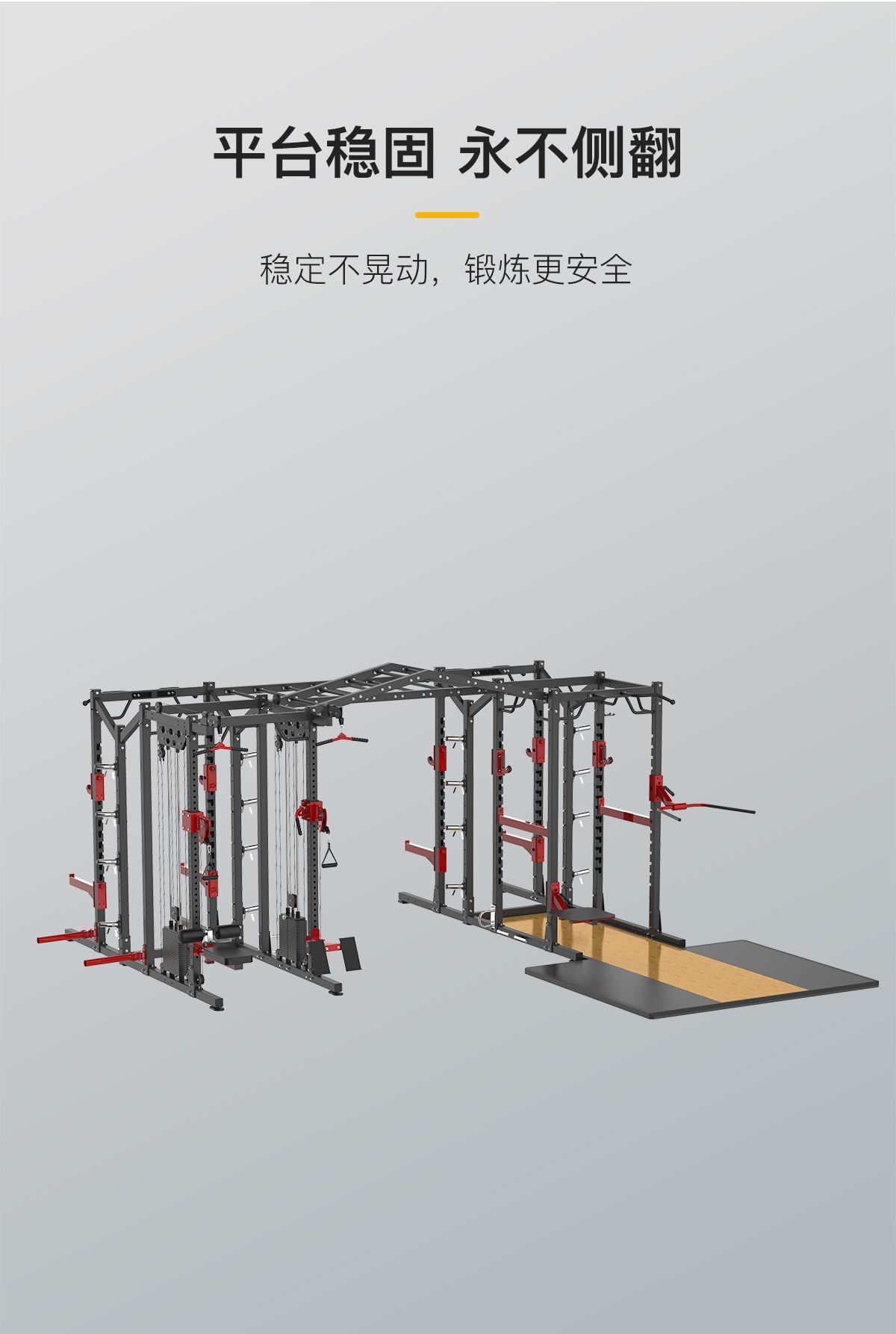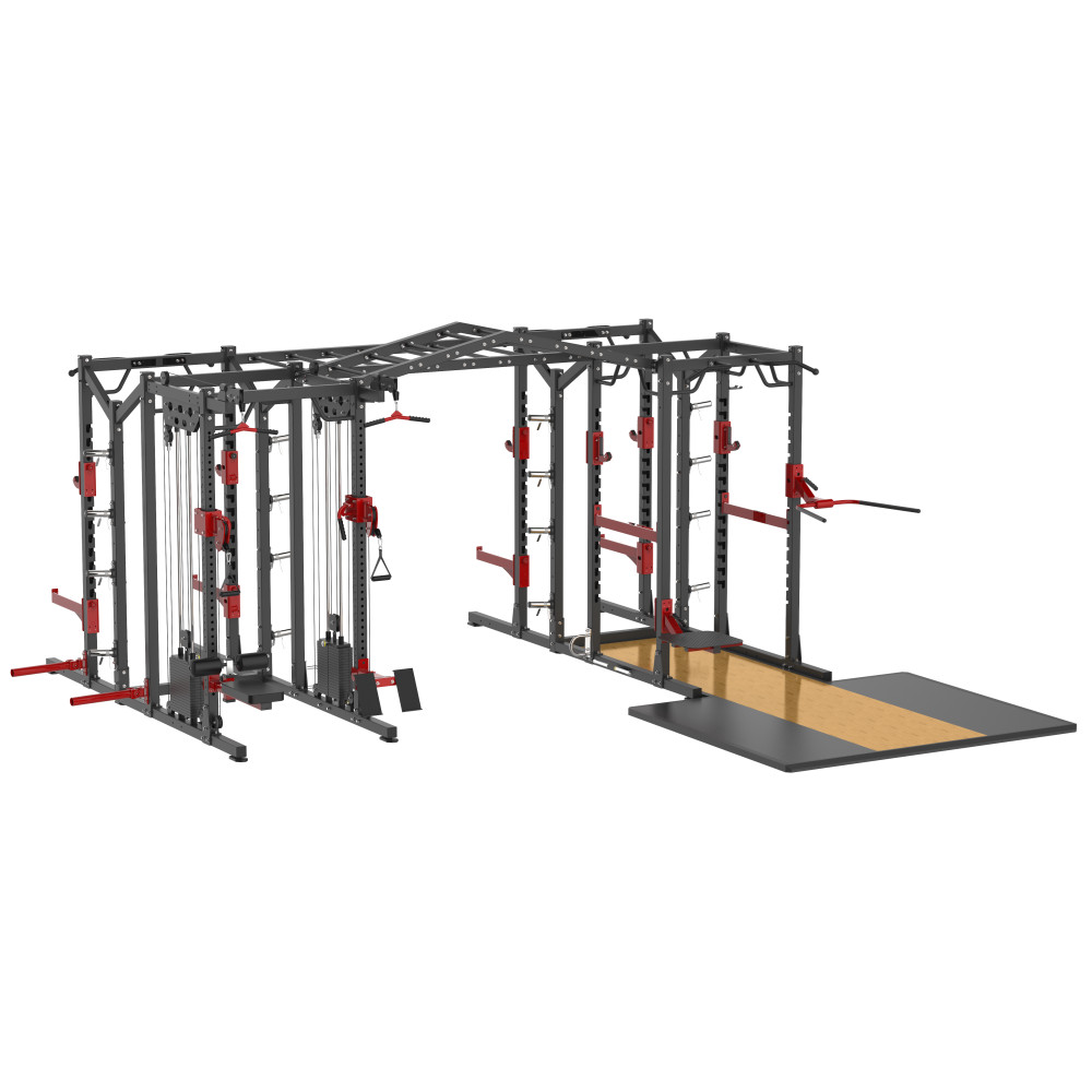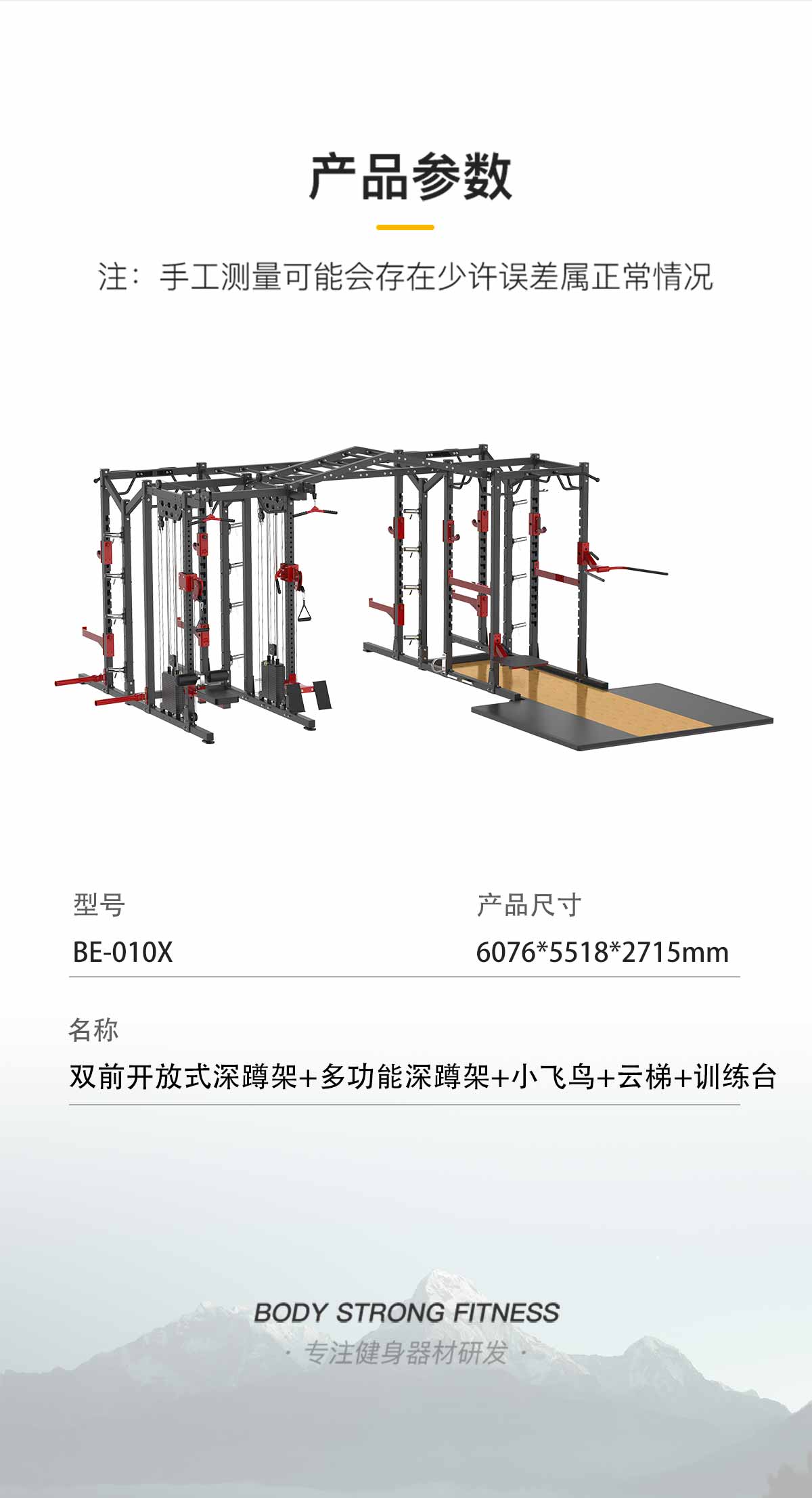 BE010X是由炮台附件+彈力帶固定附件+跳台附件+雙杠附件+戰繩架附件+橫梯+前開放式深蹲架功能模塊+多功能深(shēn)蹲架功能模塊+小飛鳥(niǎo)架(jià)模塊+組合單排收納模塊+金字塔雲梯+多(duō)功(gōng)能深蹲架訓(xùn)練台組成。