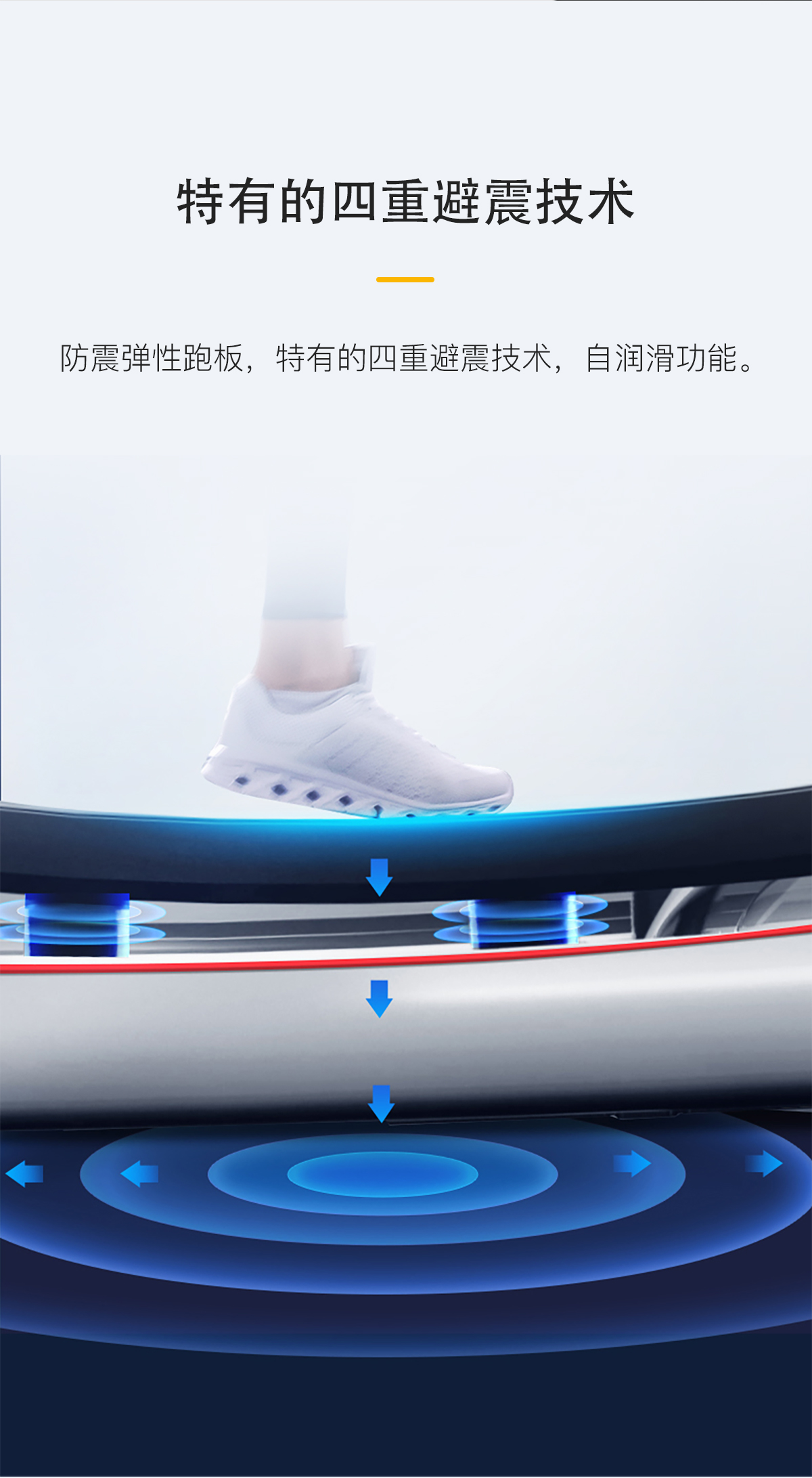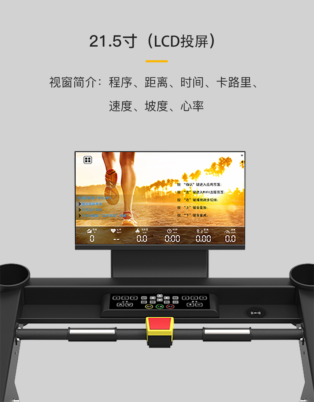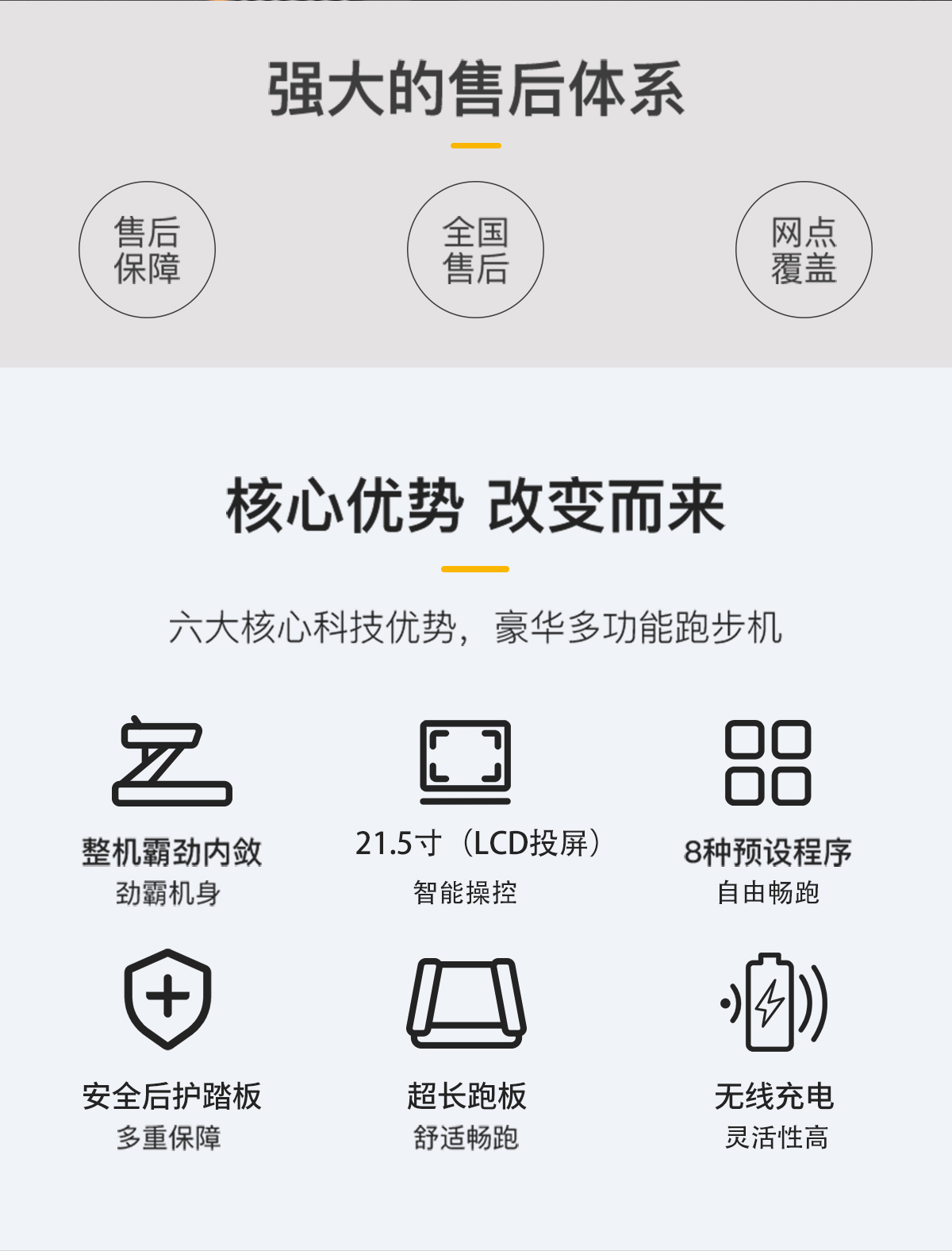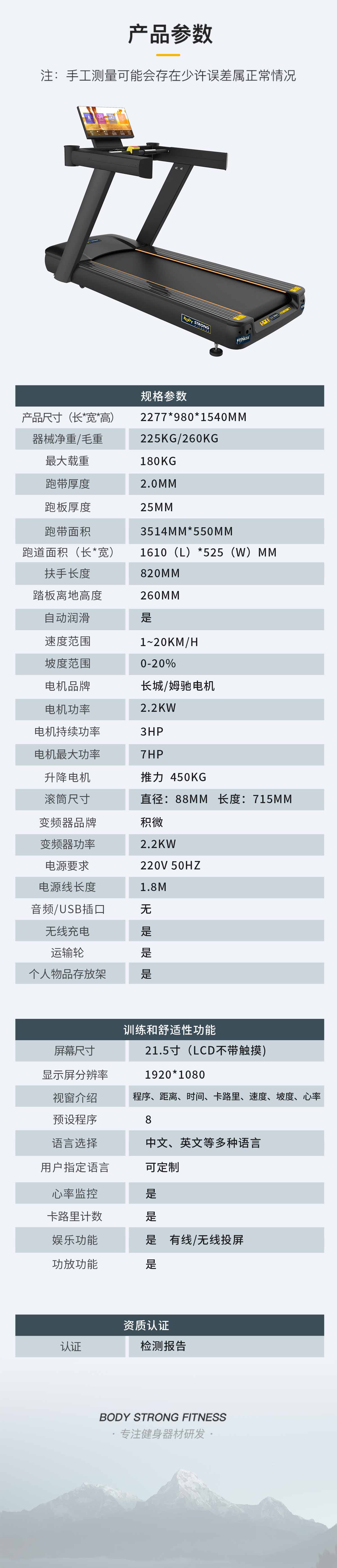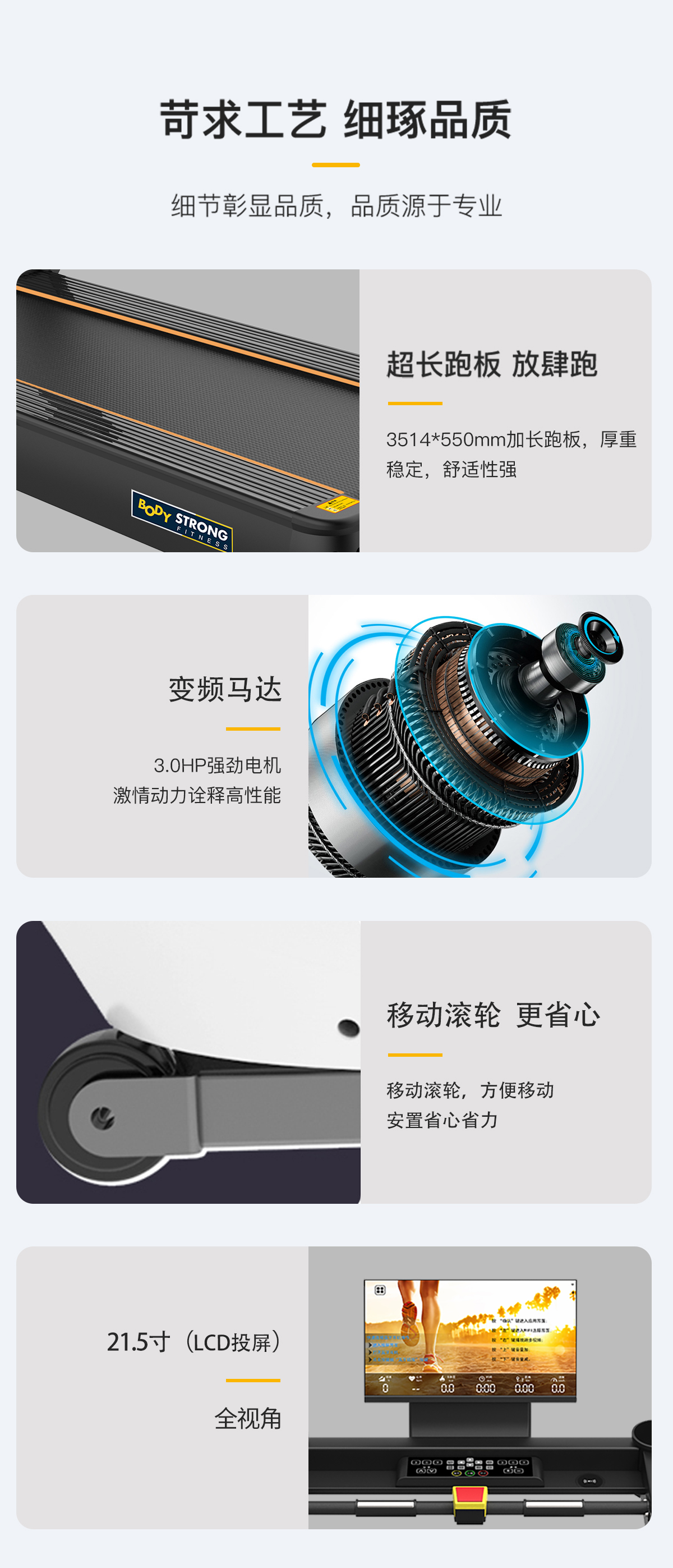 擁有四大產(chǎn)品保險、8種預設程序、超長跑板、無線充電、四重減震技術、自潤滑功(gōng)能及(jí)21.5寸LCD投屏